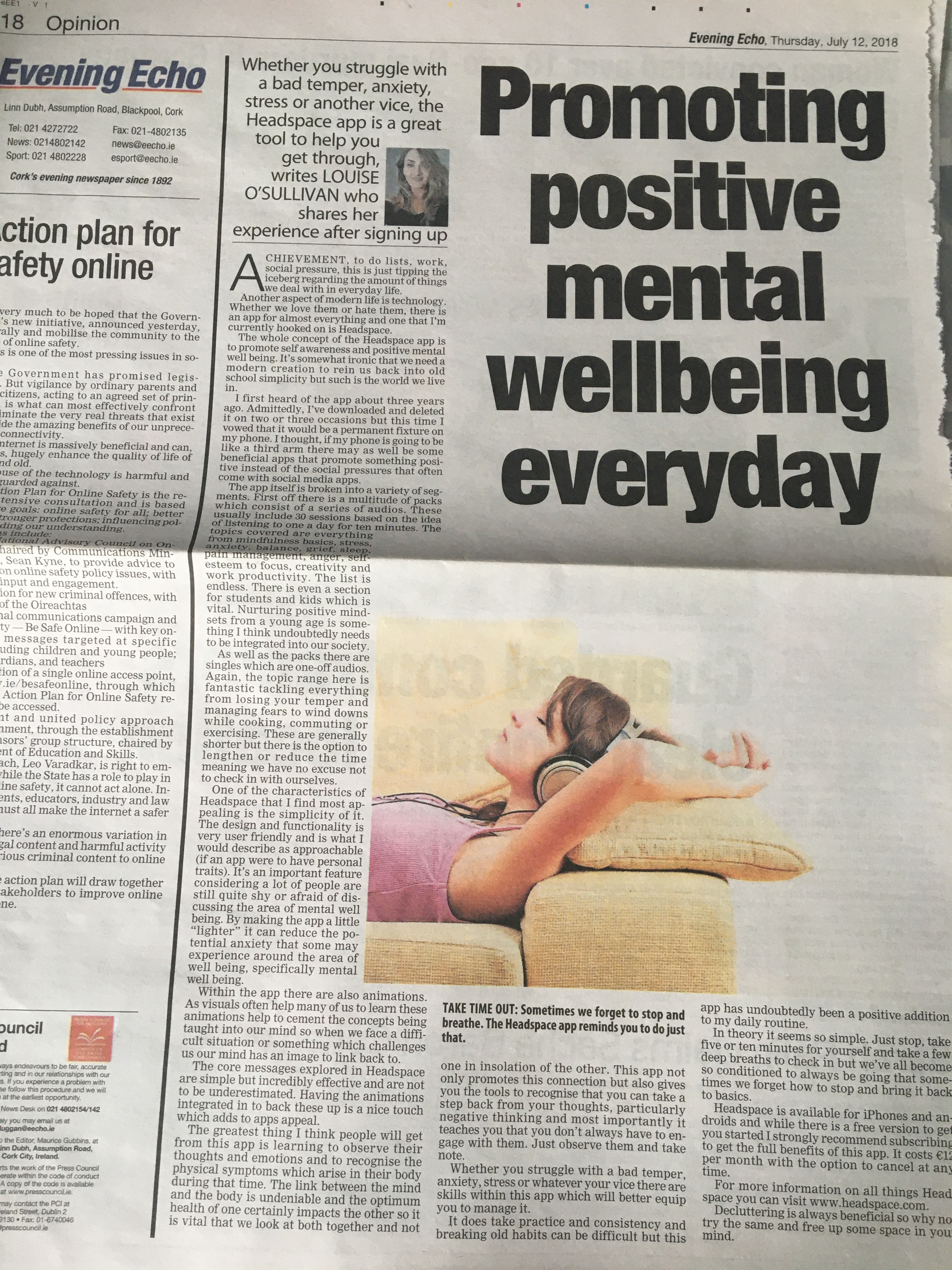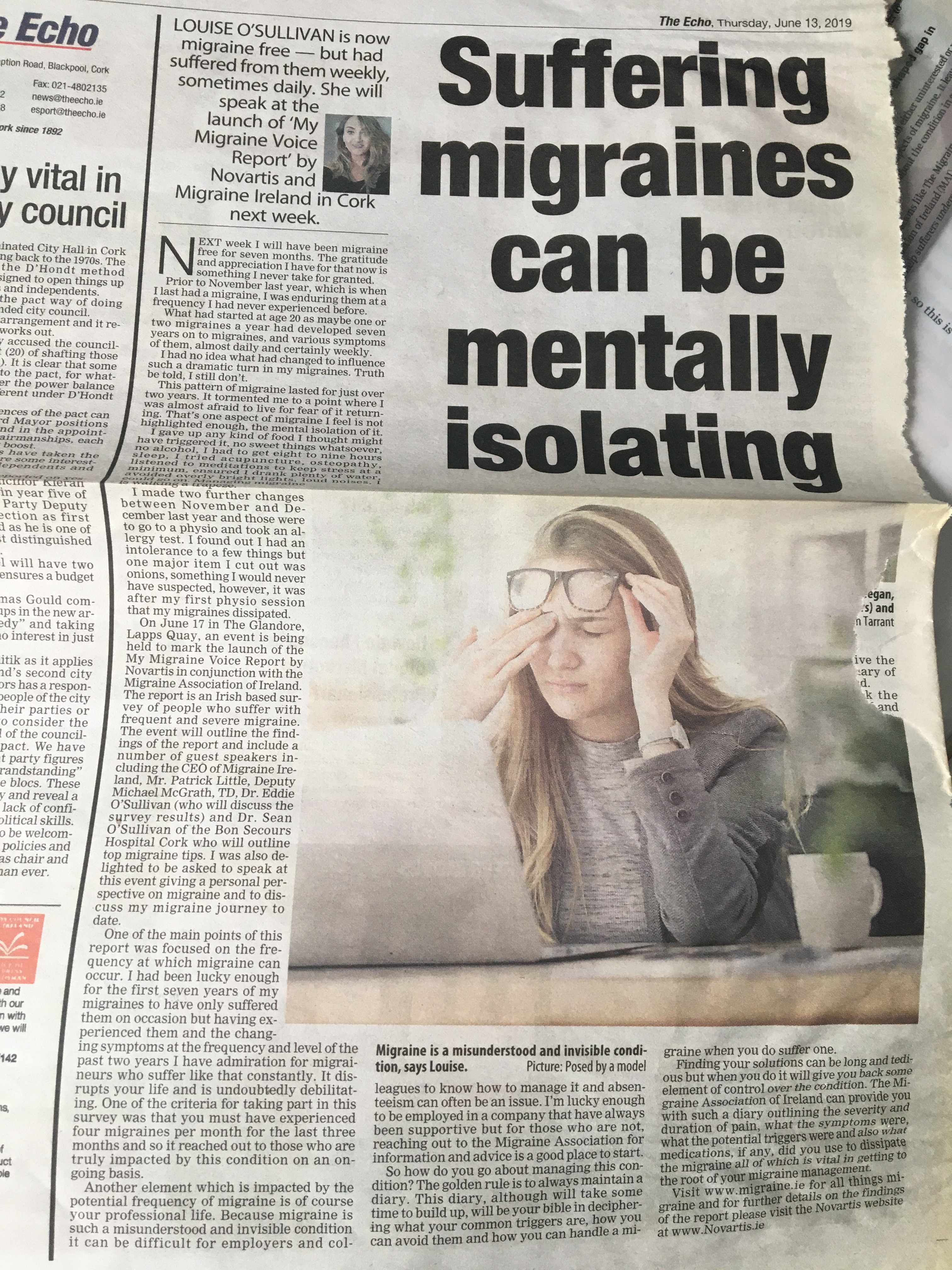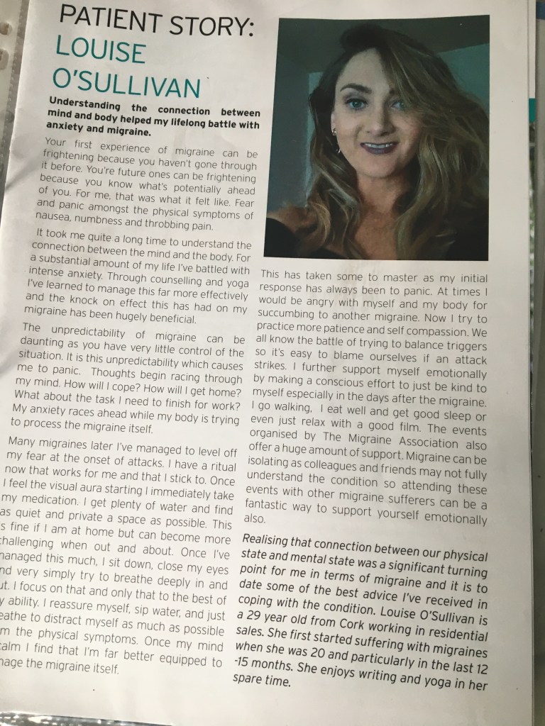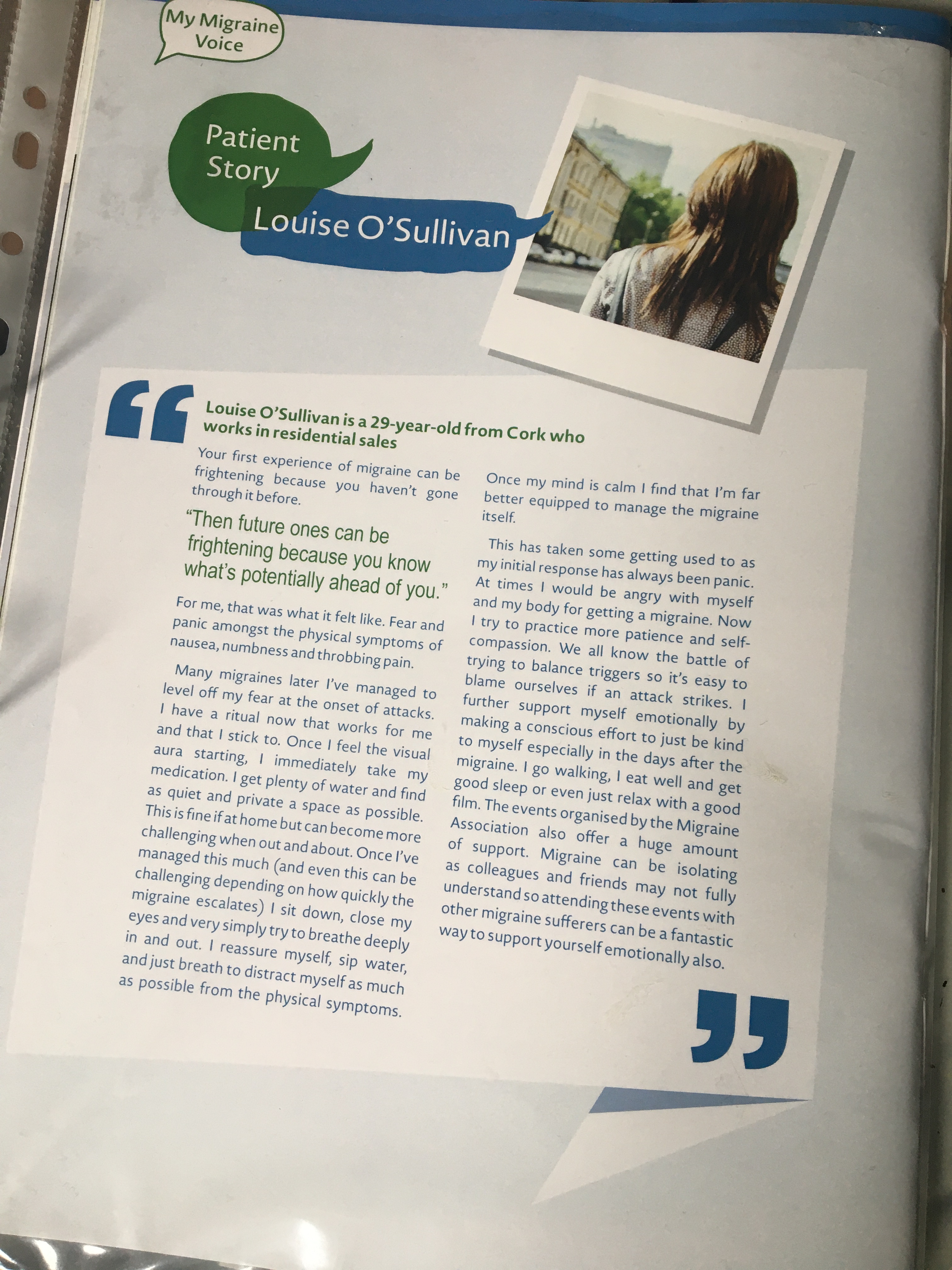 See below images for other articles included in The Echo from 2017 – present and other published work including my piece in Brainstorm – The Migraine Association of Ireland’s publication, my excerpt included in the Managing Pain supplement in the Irish Independent and also my story in the My Migraine Voice report in conjunction with Novartis and The Migraine Association of Ireland.